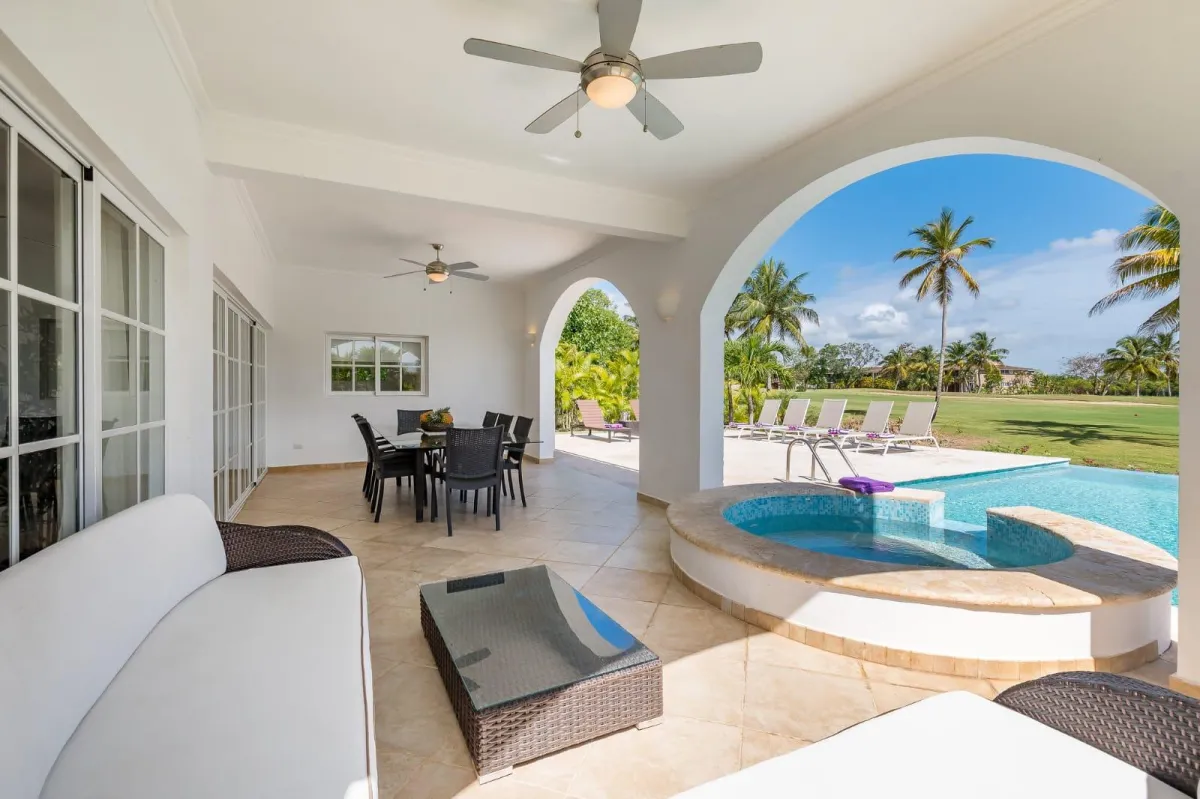 Acceso directo de la sala a la terraza con vista a la piscina, jacuzzi y campo de golf