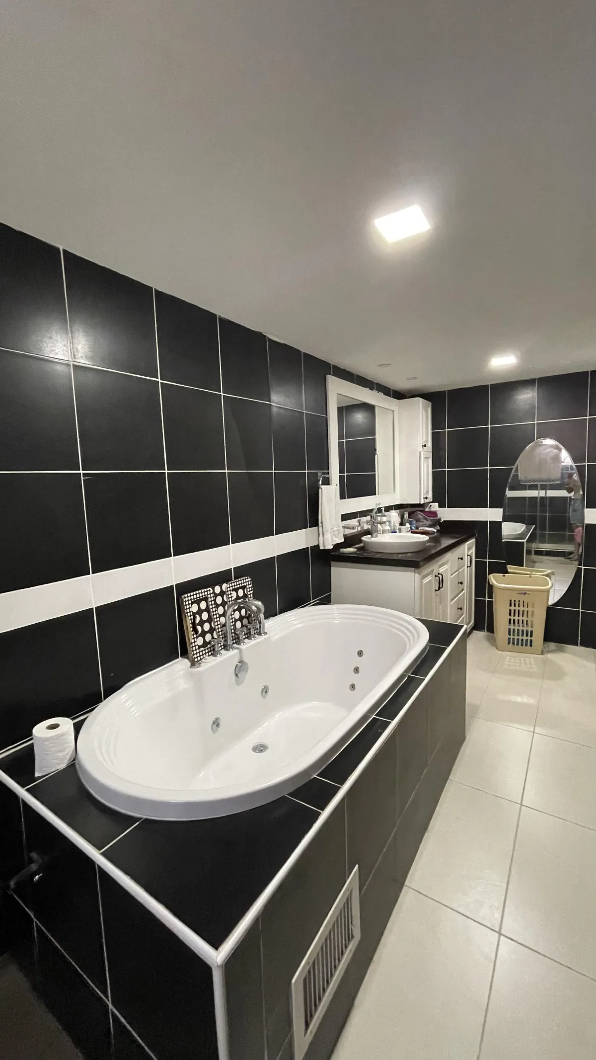 1 Habitación principal con balcón, baño con ducha y jacuzzi.